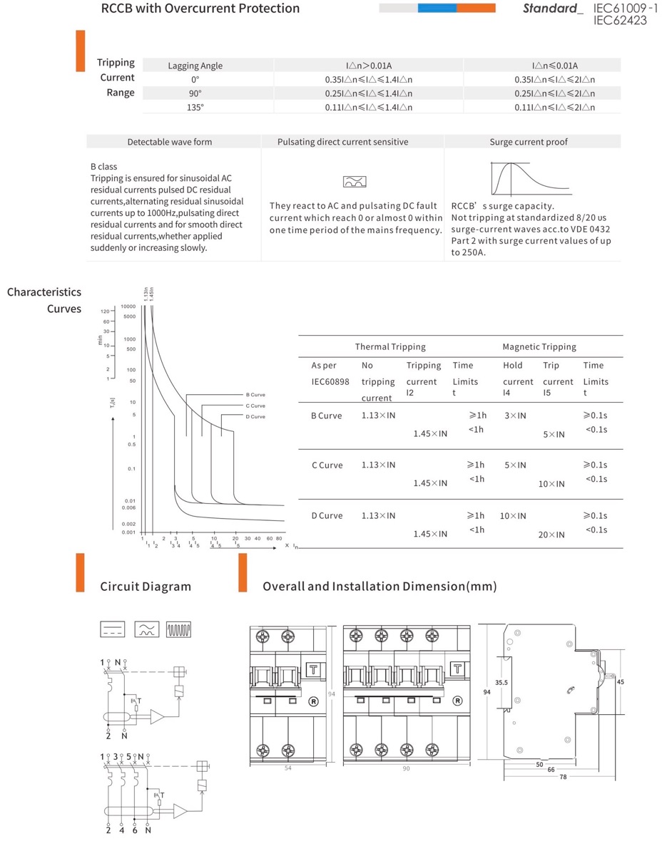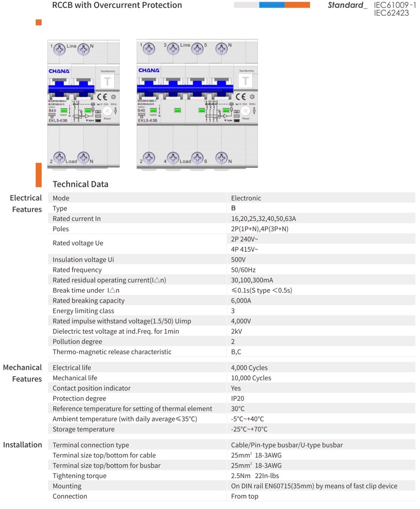 Type B, 20A and 40A, 1P and 3P RCBO Specifications
