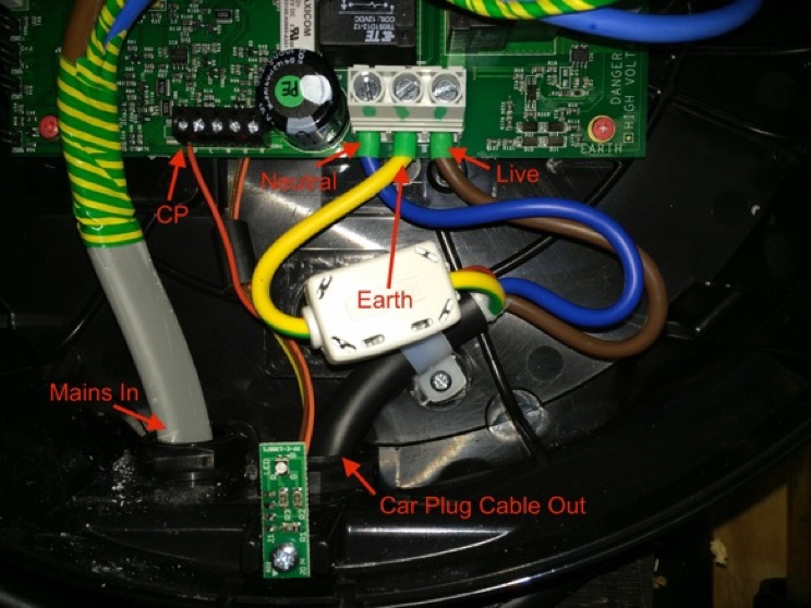 13/ Connect the wires:- Live, Neutral and Earth wires to their respective terminals. All these 3 connections should be as tight as you can get them without allowing the screwdriver to slip on the screw-head. Connect the ‘CP’ wire to its terminal. The new CP wire may be a different colour to the original but it will be clearly marked ‘CP’. It is ESSENTIAL that ALL these are correct. If you mix them up you could not only damage your EVSE...